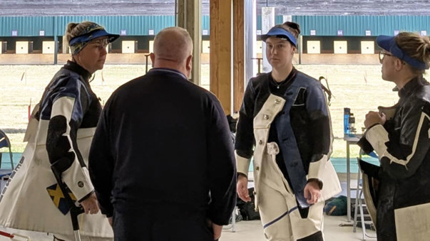 Svenska damtrion i gevär får coachning av förbundskapten Mats Eriksson.