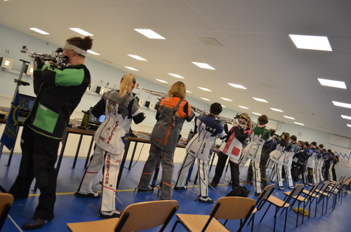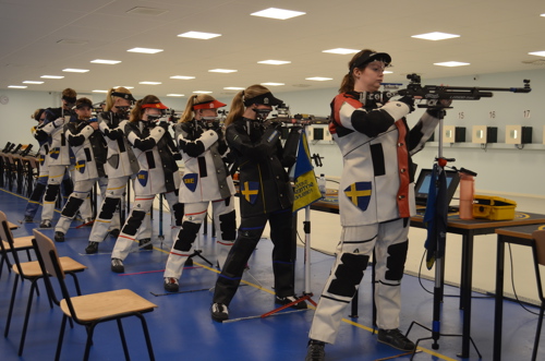 OS-skytten tillika RIG-instruktören Marcus Madsen visade eleverna hur det ska gå till då första EM-kvalet i form av Dubbelluften inleddes i Sörabyhallen i Rottne under lördagen.