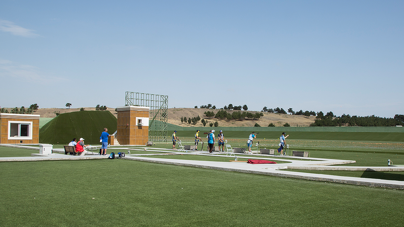 En trapbana har fem stationer som är placerade 15 meter bakom de 15 kastmaskinerna. Kastmaskinerna är placerade i rak linje och arrangerade i grupper om tre placerade framför varje skjutstation. Duvorna kastas ut i varierande höjd, sidvinkel och hastighet enligt ett av 9 olika scheman. En hel tävling omfattar 125 duvor som skjuts i serier om 25 duvor.