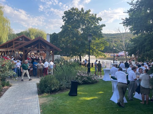 Då är VM i Compak sporting officiellt invigt. Det blev en varm tillställning där temperaturen tangerade 39 grader under dagen. Platsen som valts för invigningen var vacker med dammar och fontäner, välklippta gräsmattor i ett lummigt område kantat av skog.